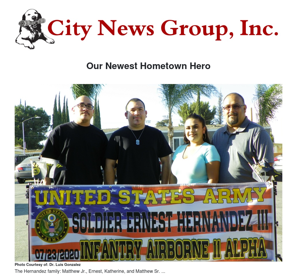 Last week, family and friends gathered at La Chapala Restaurant for a formal send-off of Colton resident, Ernest Hernandez, son of local businessman Matthew Hernandez.Two days later, on Aug. 9, Ernest reported to the recruitment office in San Bernardino, to board a bus, and was taken to Los Angeles to await a flight to begin his new career as the newest member of the U.S. Army.