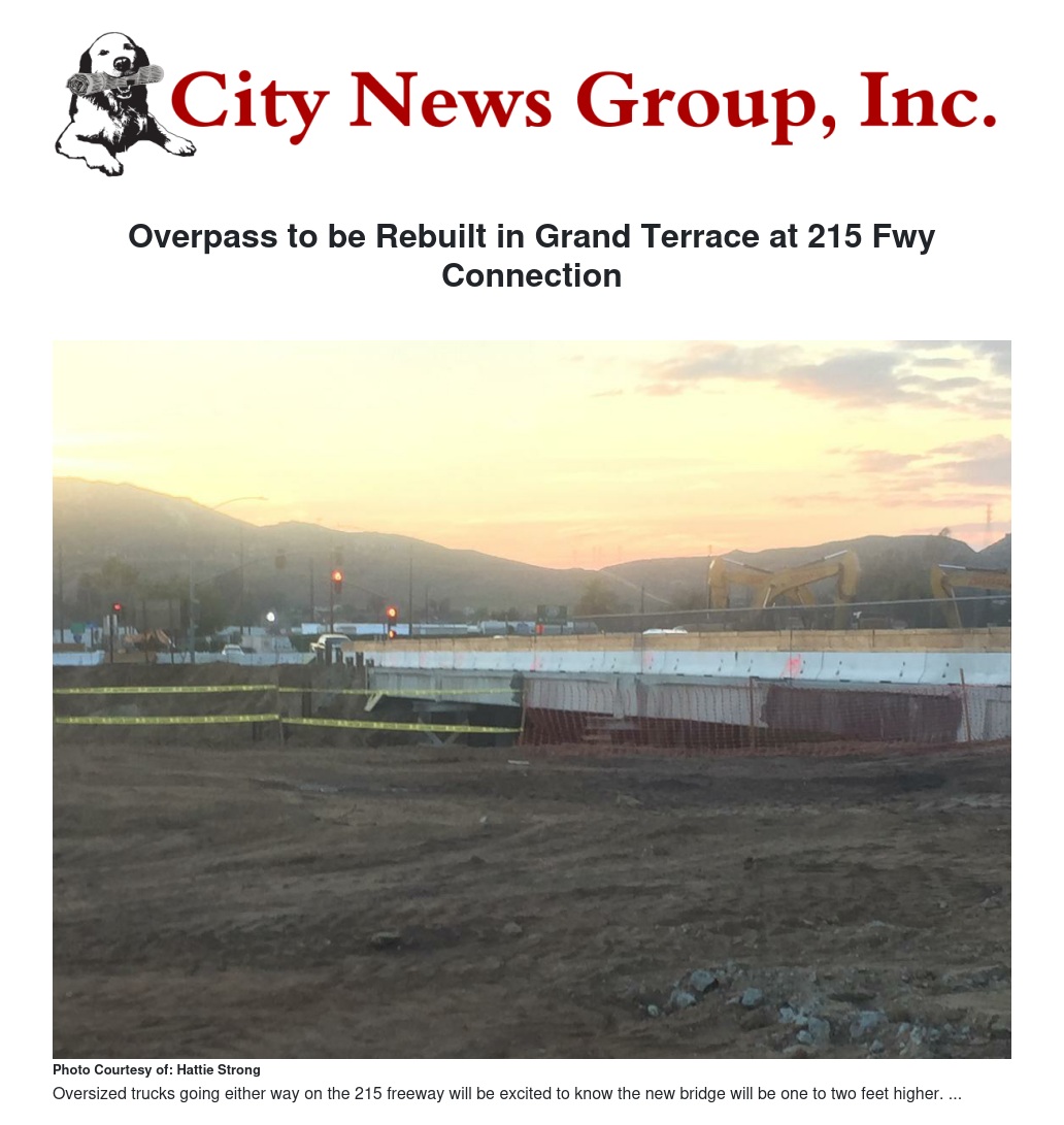 For the last few weeks the work on the Grand Terrace 215 overpass has been underway with many travelers already seeing the delays that have been created by the work being done. The overpass project is estimated to cost nearly $105 million with several evenings of freeway closures to be scheduled throughout the build out timetable. As has been seen, the construction crews have demolished the southern part of the overpass, with traffic being shifted to the remaining part of the bridge while the new portion of the bridge is being constructed. After, the new portion of the bridge has been finished, traffic will then be moved to the new overpass and the rest of the old bridge will be destroyed. The work has been scheduled to be completed by the spring of 2020, with the new bridge being widened from one lane to two lanes, and lengthen to hopefully take care of any future expansion of the 215 freeway.
