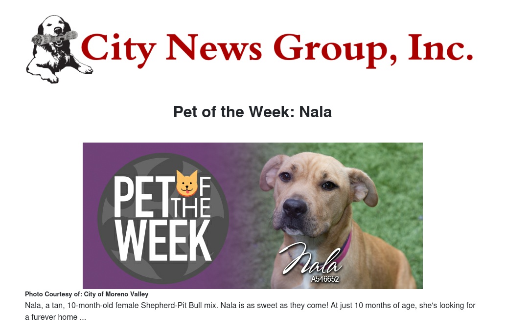 If you would like to make Nala or any pet from the Moreno Valley Animal Shelter part of your family, please call 951.413.3790 or visit moval.org/pets.