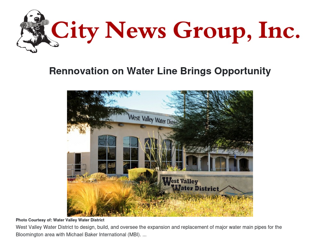 To facilitate population, commerce and job growth for underserved areas of the Bloomington region, the West Valley Water District (WVWD) Board of Directors approved a contract with Michael Baker International (MBI), one of the nation’s leading providers of engineering and consulting services, to design, build, and oversee the expansion and replacement of major water main pipes for the community.