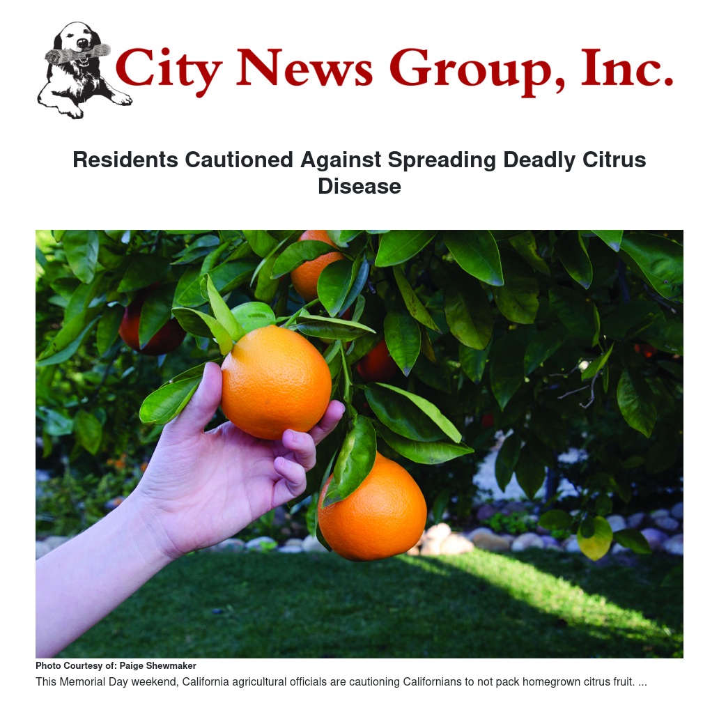 According to AAA Travel, more than 37 million Americans will begin their summer travels on Memorial Day weekend this year – a 60% increase from 2020. While most travelers are mindful to take extra care of their personal health while traveling during the pandemic, officials are urging Californians to also be mindful of the health of California’s citrus trees by obeying plant quarantine restrictions and taking extra precaution when gifting citrus fruit from backyard trees.