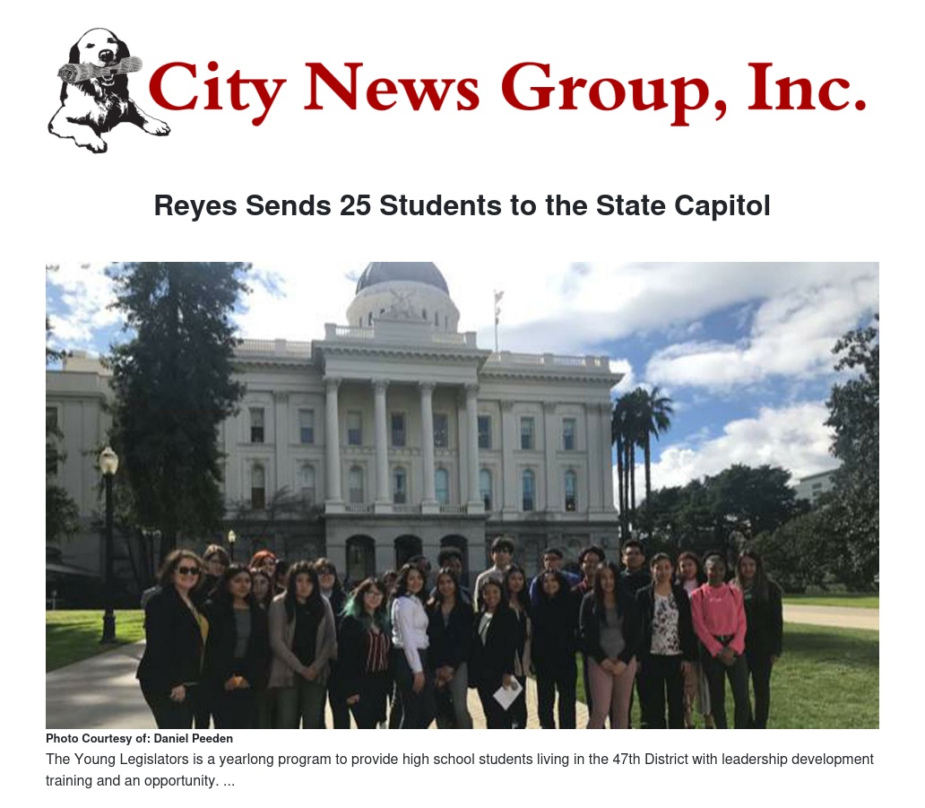 The Young Legislators is a yearlong program to provide high school students living in the 47th District with leadership development training and an opportunity to discuss important youth related issues occurring in the community. Assemblymember Reyes is currently accepting applications for the next class of Young Legislators on her website.