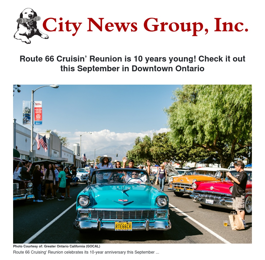 The 10th Anniversary Route 66 Cruisin’ Reunion, powered by Greater Ontario California (GOCAL), will attract thousands of visitors to historic Euclid Avenue for two days of cruisin’, contests, live entertainment, fabulous food, and revelry. Much more than a car show, this year’s event will offer visitors an experience they won’t soon forget.