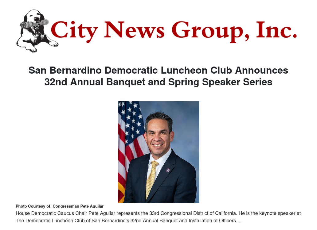 SAN BERNARDINO, CA — The San Bernardino Democratic Luncheon Club announces its upcoming schedule of events, headlined by the 32nd Annual Banquet and Installation of Officers on March 14, 2026. This landmark event will feature Congressman Pete Aguilar as the guest keynote speaker.