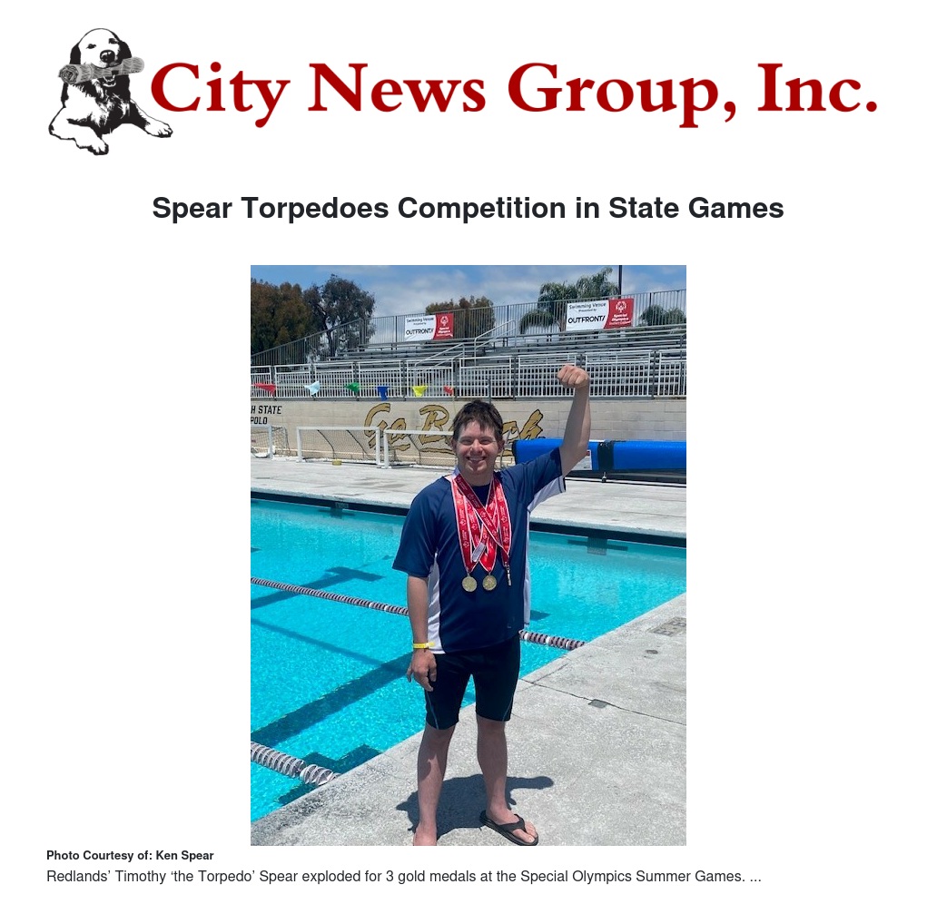 Redlands’ Timothy ‘the Torpedo’ Spear exploded for 3 gold medals at the Special Olympics Summer Games at Cal State Long Beach June 8-9.
