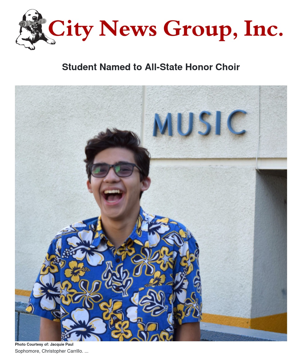 Congratulations to sophomore Christopher Carrillo, who has been selected to participate in the prestigious California Choral Director's Association (CCDA) All-State Honor Choir.