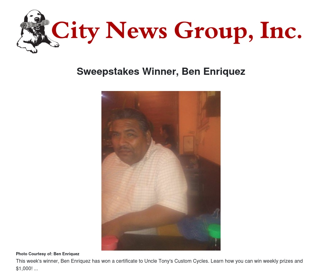 Ben Enriquez is this week’s winner of the City News Group, Inc. $1,000 sweepstakes opportunity drawing! As this week’s winner of the weekly prize giveaway, Enriquez has won a $30 gift certificate to Uncle Tony’s Custom Cycles.