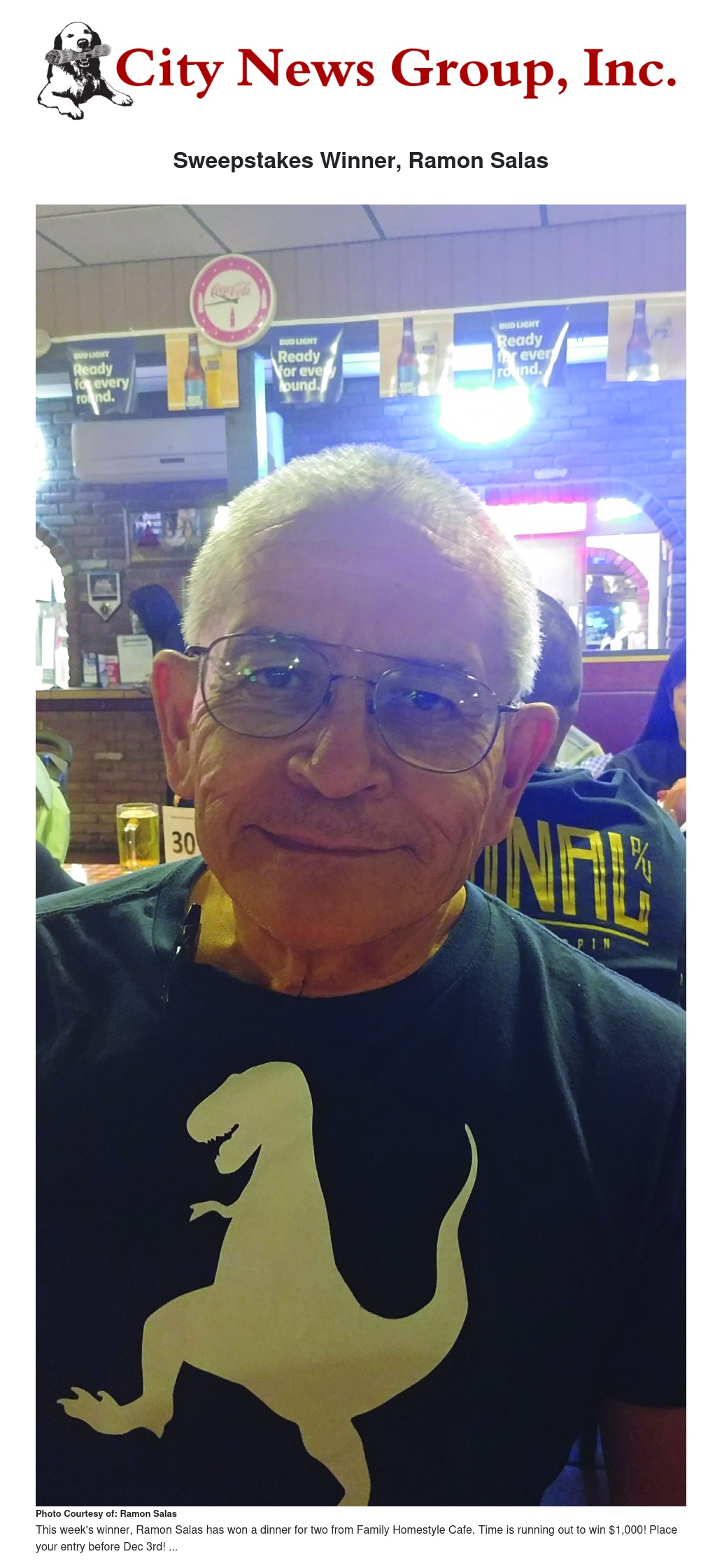 Ramon Salas is this week’s winner of the City News Group, Inc. $1,000 sweepstakes opportunity drawing. As this week’s winner of the weekly prize giveaway, Salas has won a dinner for two from Family Homestyle Café.