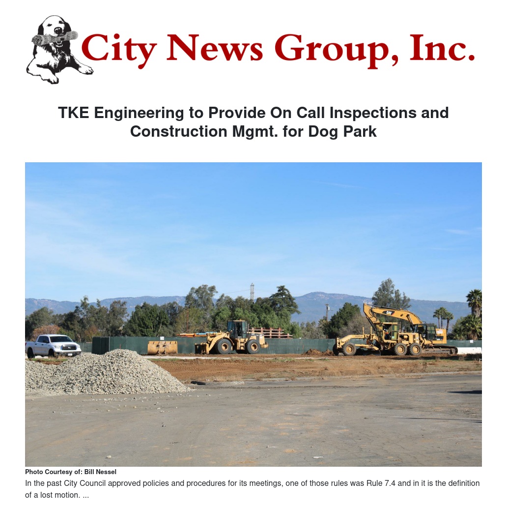 TKE Engineering to Provide On Call Inspections and Construction Mgmt. for Dog Park by Hattie Strong - City News Group, Inc.