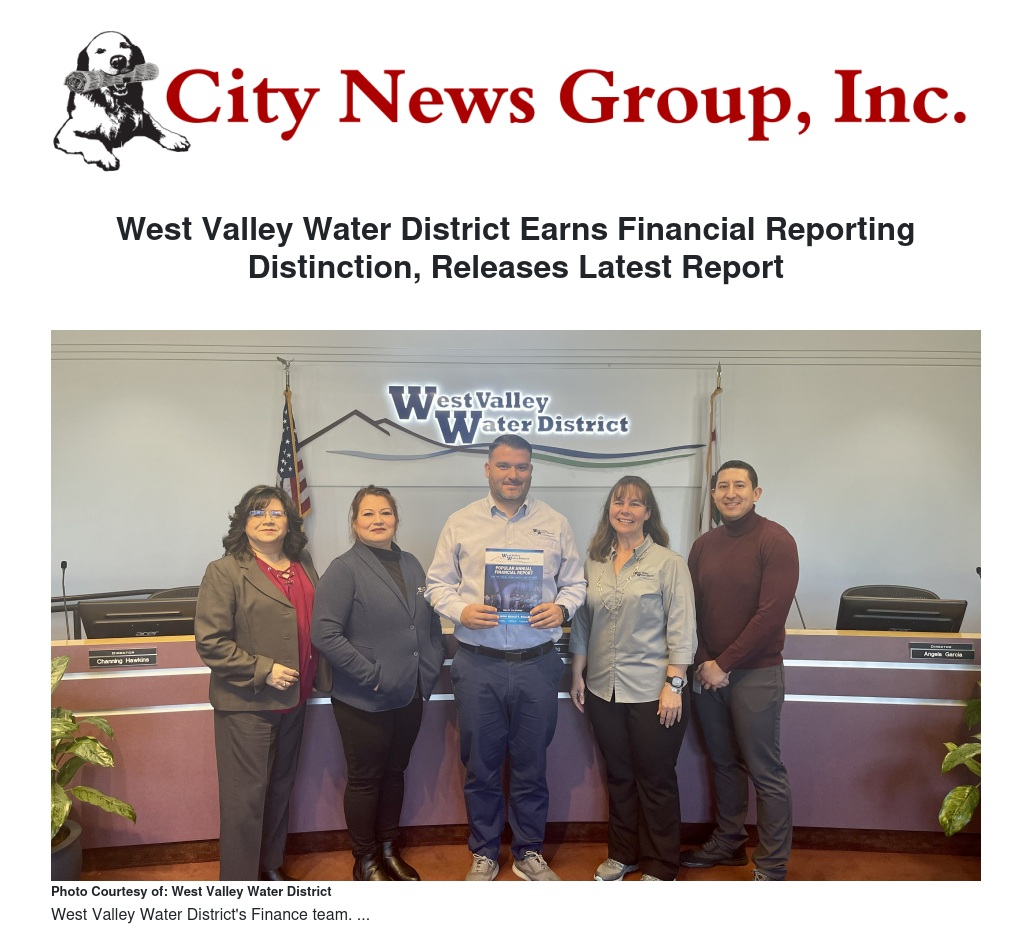 “This award for our first PAFR submission to the GFOA is a significant achievement for the West Valley Water District. It reflects our strong commitment to financial transparency and accountability,” said WVWD Board President Greg Young. “On behalf of the board, I commend our finance department for their excellent work on the report and their continued efforts to build public trust through publishing transparent and accessible information.”