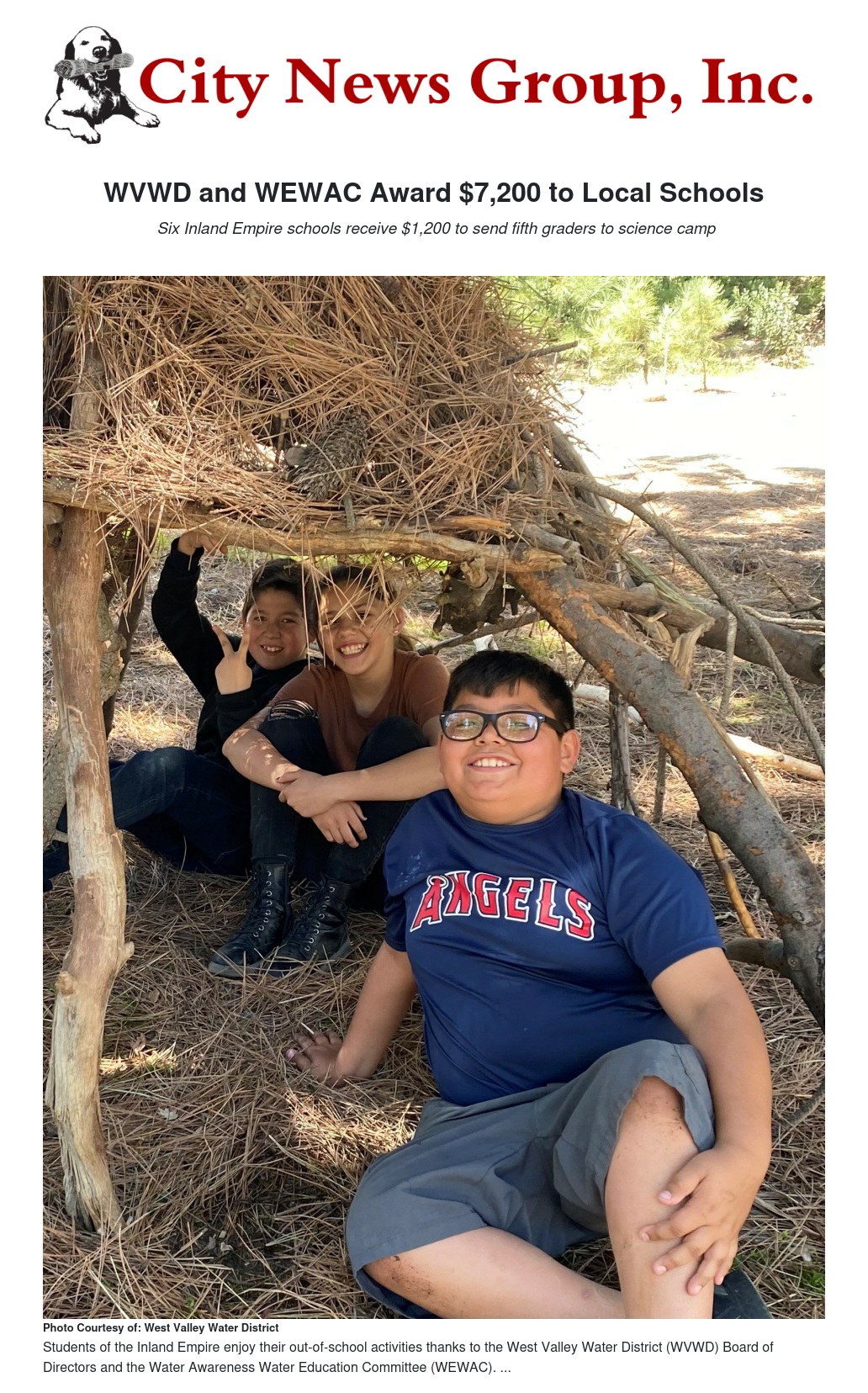 The West Valley Water District (WVWD) Board of Directors in partnership with the Water Awareness Water Education Committee (WEWAC), a consortium of Southern California cities, water agencies, and water education professionals that work together to promote water conservation and education, announced that six classrooms in the Rialto Unified School District received $1,200 to send 5th graders to science camp.