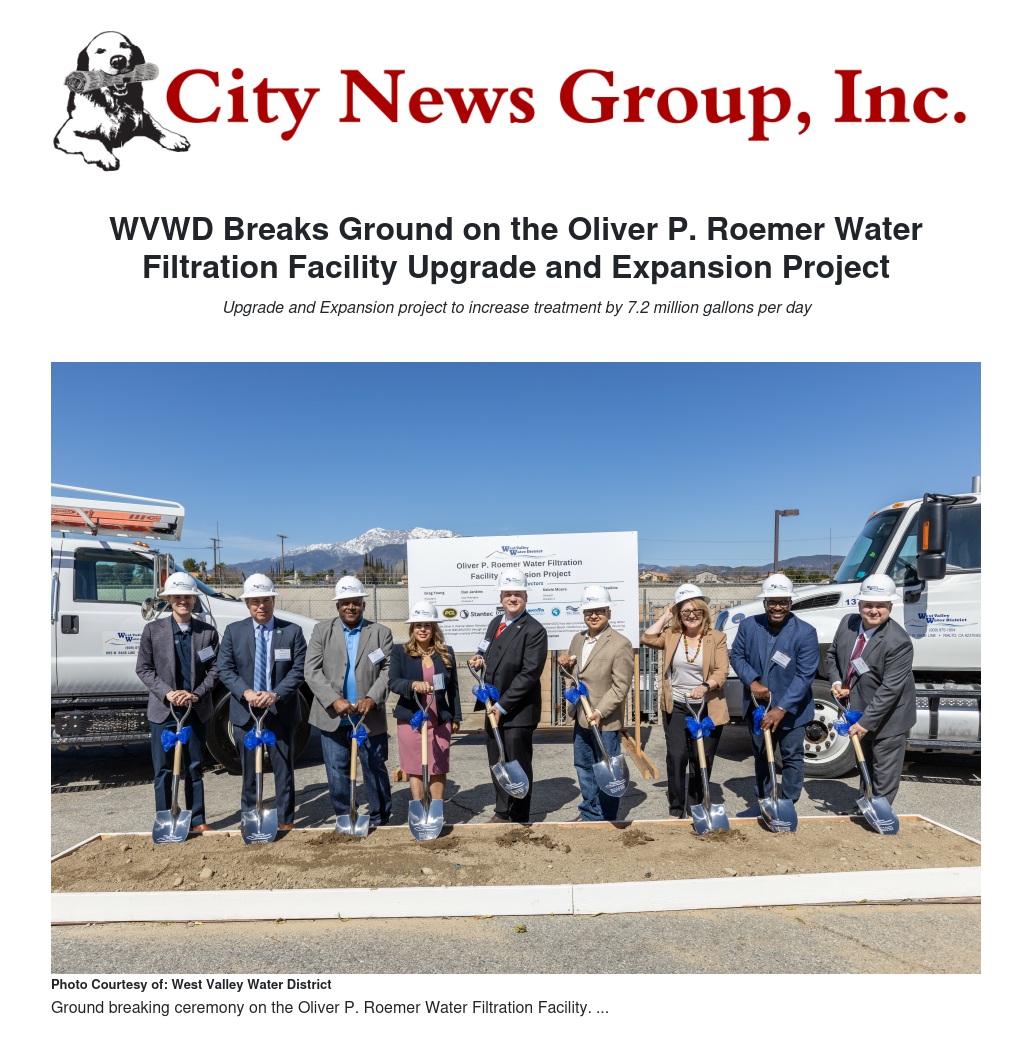 On Saturday, March 18, the West Valley Water District (WVWD) joined government and community leaders to break ground on the Oliver P. Roemer Water Filtration Facility (Roemer) Upgrade and Expansion Project, which will secure the long-term security of WVWD’s water supply by increasing its treatment capacity by 7.2 million gallons per day which is enough to supply water to over 10,000 homes.